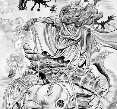 一方の槍は二叉となっていますが、形としては左右非対称でやや不自然な形とも言えます。そのため、元々の形は三叉槍であったと考えられ、何らかの理由でわざと欠けたデザインにしているのかもしれません。もし仮にこの槍が三叉槍なのであれば、三叉槍はクトゥルフ神話に登場する海の神「ノーデンス」が持つ武器とされ、海に関連するものとしても合致します。