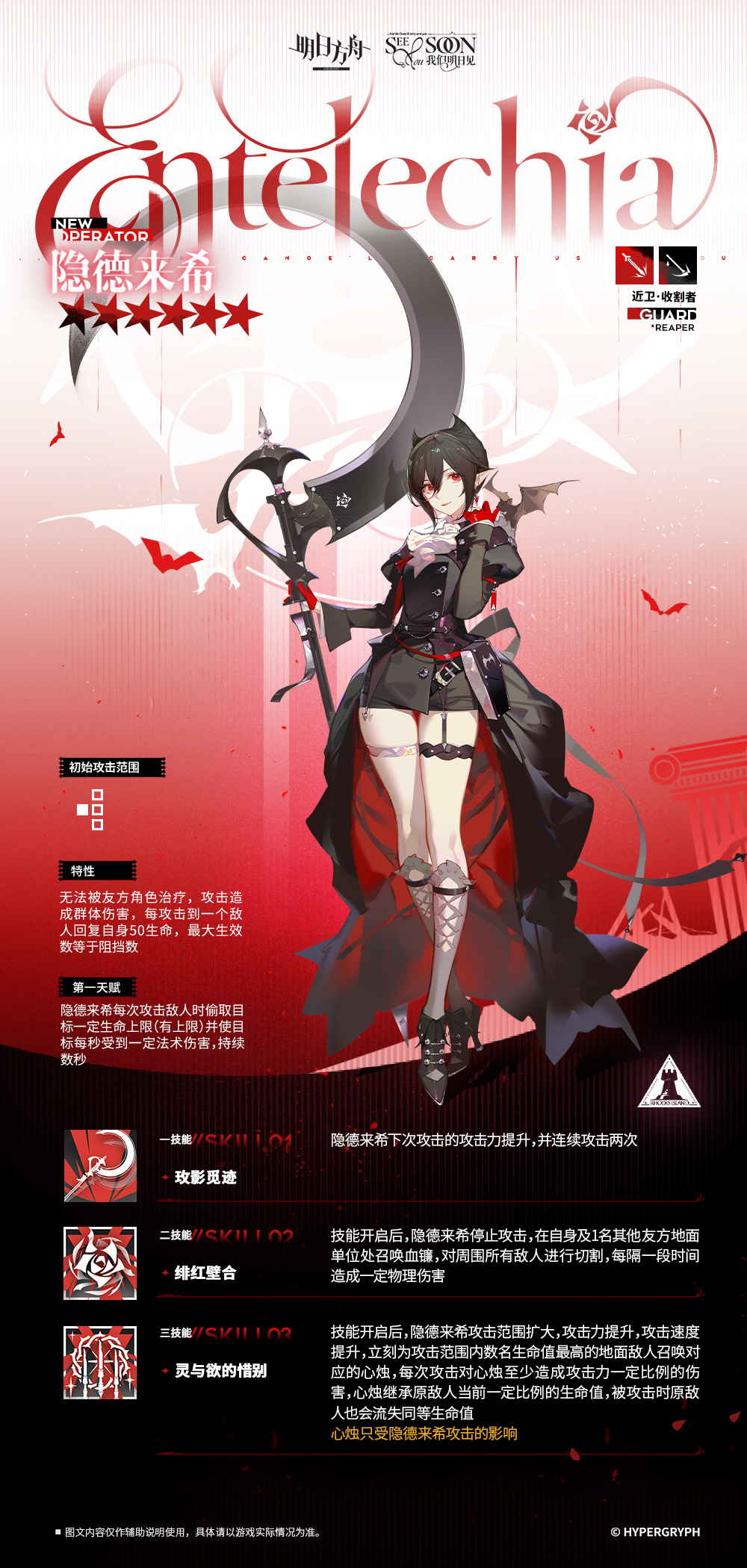 - スキル3:スキル発動後、攻撃範囲拡大、攻撃力上昇、攻撃速度上昇、攻撃範囲内にいる最もHPが高い数体の地上敵にハートキャンドルを召喚、攻撃の度にハートキャンドルに攻撃力の一定割合のダメージを与える。ハートキャンドルは元の敵の現在のHPの一定割合を継承し、攻撃されると元の敵も同等のHPを失う。ハートキャンドルはエンテレケイアの攻撃のみ受け付ける。