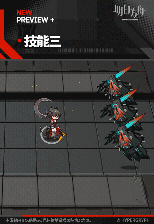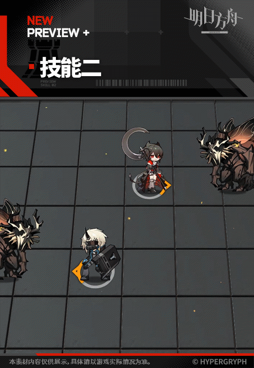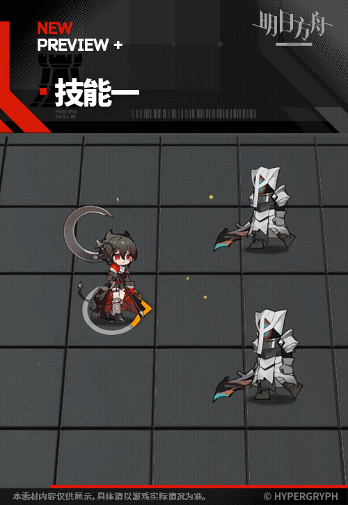 - スキル2:スキル発動後、攻撃を停止、自身と地上オペレーター1人に血鎌を召喚し、周囲の全ての敵を攻撃。一定時間毎に物理ダメージを与える。