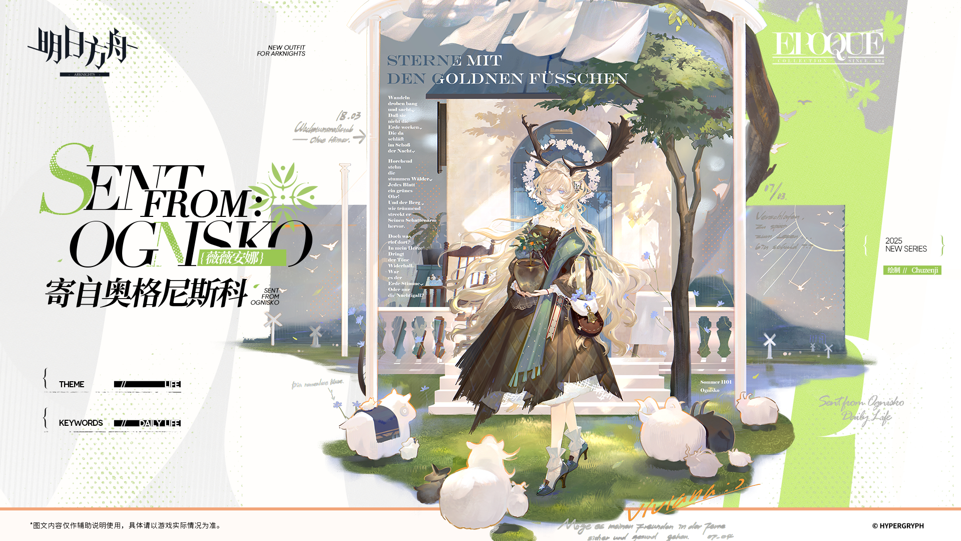 【アークナイツ大陸版】ヴィヴィアナ専用コーデ「オグニスコより」 アークナイツ X Mastodon Bluesky Misskey Facebook コピー 2025.02.13 EPOQUEシリーズ「オグニスコより」。 ヴィヴィアナがオグニスコに戻った時の衣装。 純手作りのリネンのロングスカートにニットのストールを合わせ、彼女は並木道を職人の声を聞きながら歩く。 風見鶏が今日の目的地を選ぶ。彼女のフェルトの友人達が彼女を取り囲み、沿道に咲く名もなき花が彼女を夢想に浸らせる。彼女はすぐにここを再び去る事になるかもしれないが、詩はこの歳月を色合わせたものにはさせない。
