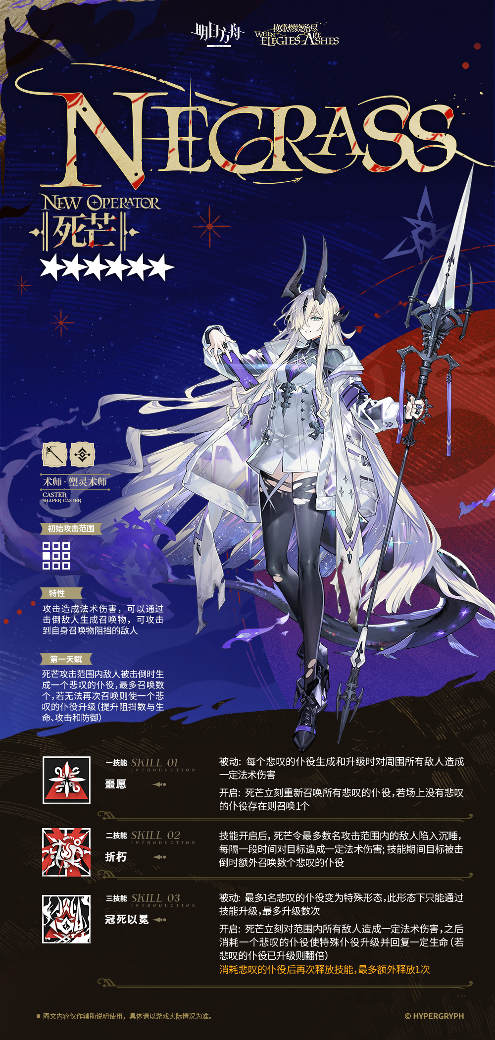 - 素質1:攻撃範囲内にいる敵が撃破された時、悲嘆の従僕を召喚。最大で数体召喚可能、召喚数が最大に到達時、召喚を行う代わりに悲嘆の従僕のアップグレードする(ブロック数、HP、攻撃力、防御力上昇)