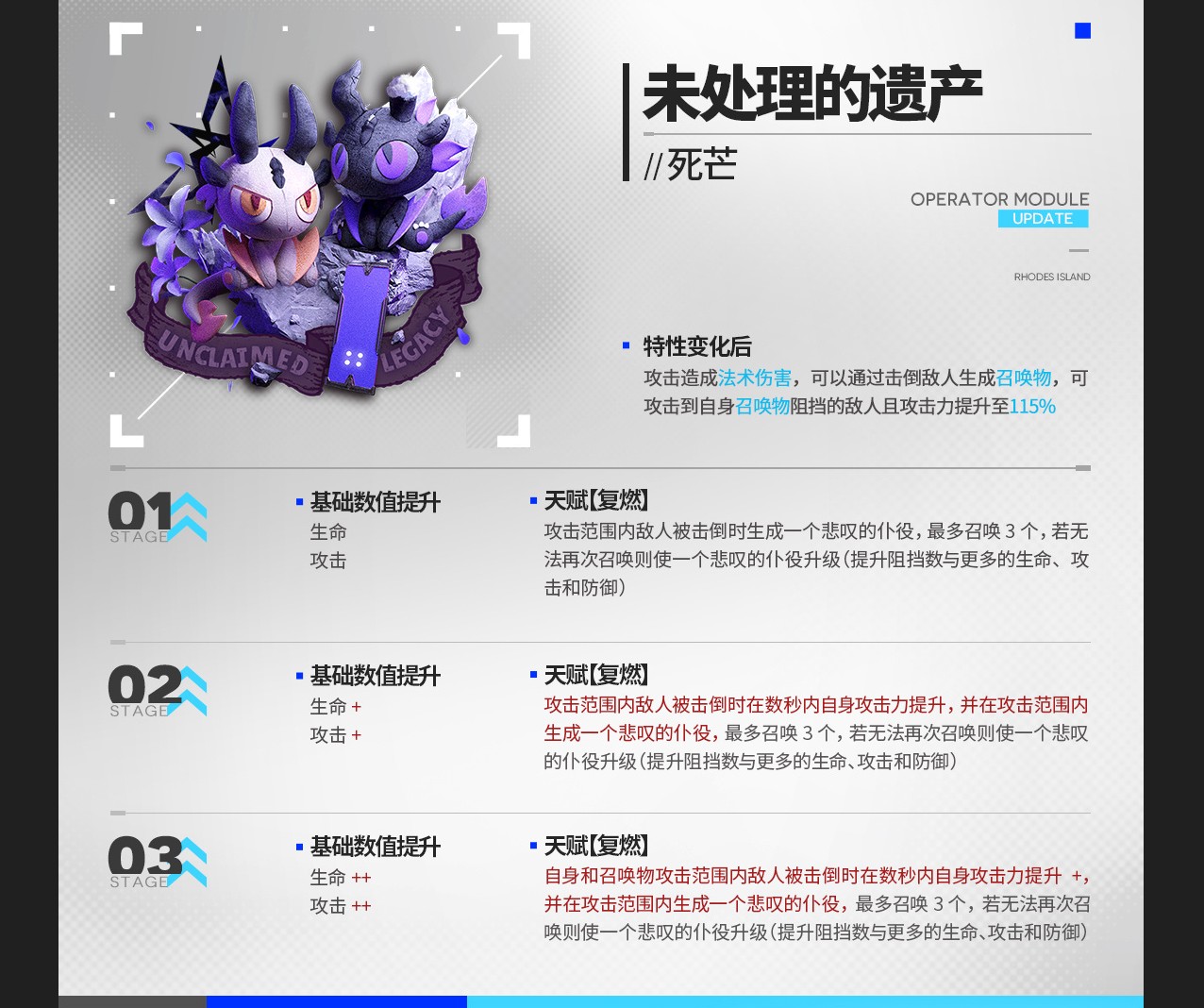 | 敵に術ダメージを与える。 倒れた敵から召喚物を生成し、自身はその召喚物がブロック中の敵を攻撃でき、攻撃力が115%まで上昇する。 |