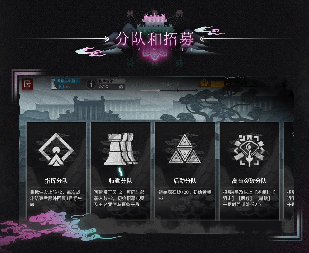 探索を開始する際、今回の探索分隊を選択する必要があり、それぞれの分隊では異なる戦術効果が提供されます。今回の統合戦略ではより豊かな分隊の種類を選ぶことが可能で様々な分隊はアンロック条件をクリアする事で解放する事が出来ます。