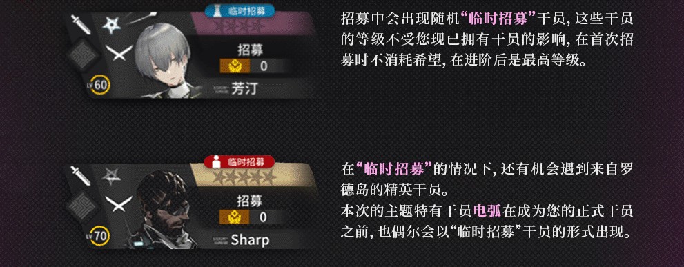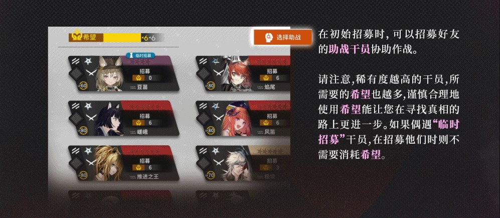 レアリティの高いオペレーターほど必要な希望は多くなります。慎重かつ合理的に使用する事は真実を探す道をより歩ませる希望となるでしょう。「臨時招集」のオペレーターに偶然遭遇して招集した場合は希望を消費する事はありません。