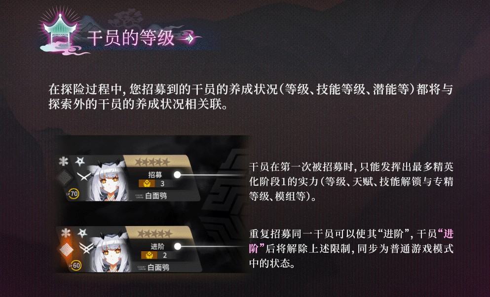 探索の過程であなたが招集したオペレーターの育成状況(レベル、スキルレベル、潜在強化など)はあなたが探索外で育成したオペレーターのレベルと同じとなります。