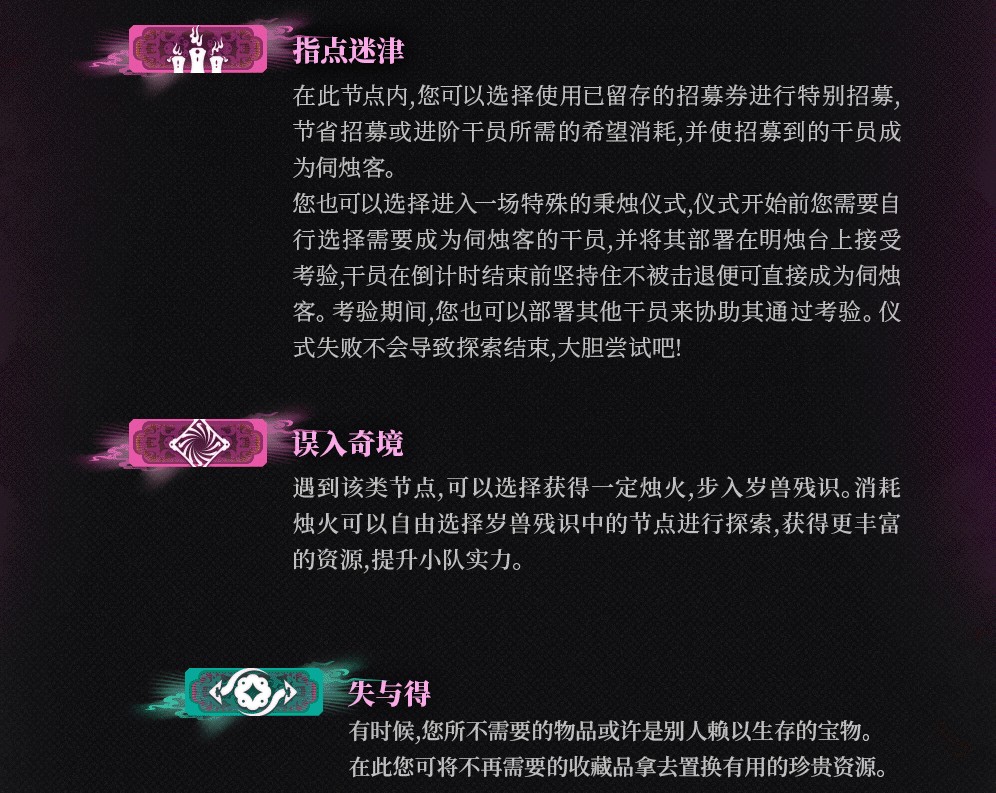 一定の蝋燭の火を得た後に歳獣の残留意識に進入出来ます。蝋燭の火を消費する事で歳獣の残留意識内を自由に探索でき、より豊富な資源を獲得して小隊の強化が出来ます。