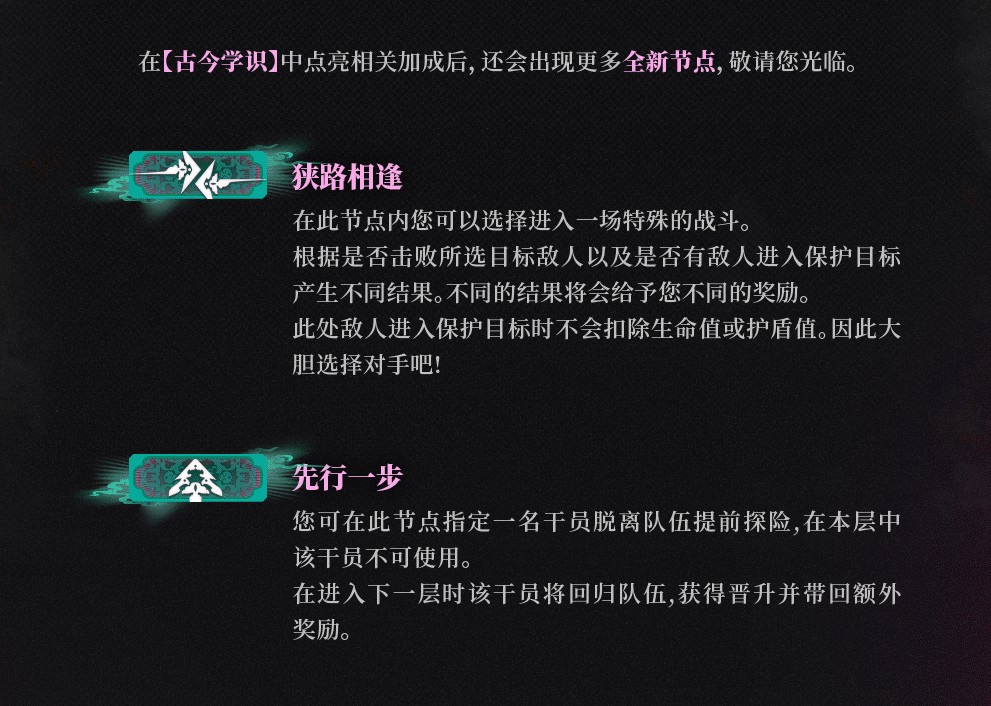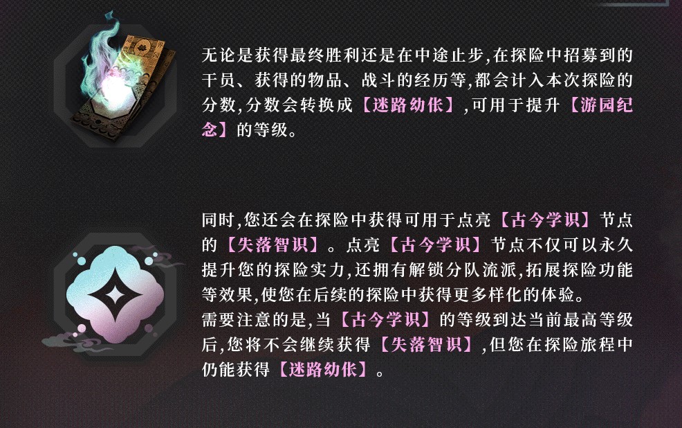 探索中は「古今学識」のノードを解放する際に使用する「失われた知識」を得る事が可能です。「古今学識」のノードを解放する事で、探索の実力を永続的に向上させるだけでなく、分隊の流派の延長として、探索機能を拡張させるなどの効果も存在。今後の探索でより多様な経験を得る事が可能です。