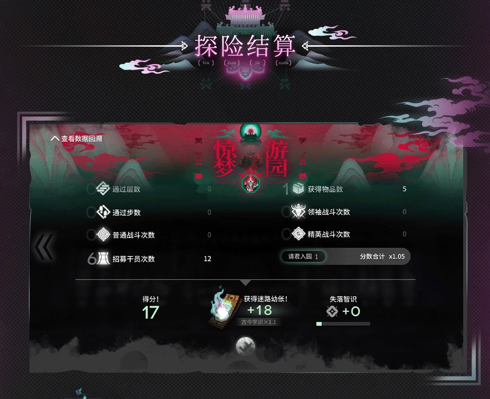 最終的に勝利した場合でも途中で探索が終了した場合でも、探索中に招集したオペレーター、獲得したコレクション、戦闘歴などは今回の探索の点数として集計され、点数は「迷子の幼悪鬼」に変化され、「遊園記念」のレベルアップに使用する事が可能です。