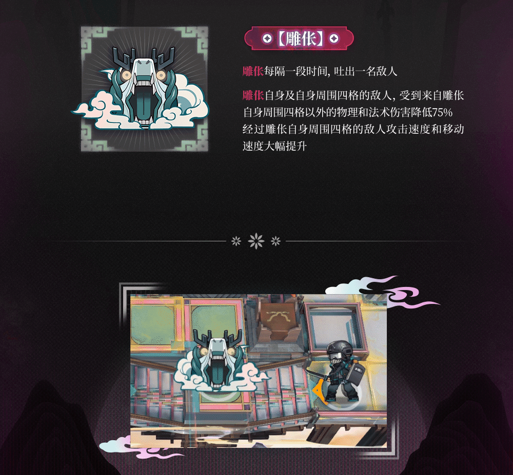 - 雕像自身及び自身の周囲4マスの敵は雕像の周囲の4マス以外から受ける物理及び術ダメージを75%軽減し、雕像自身と周囲4マスにいる敵の移動速度を大幅に上昇させる。