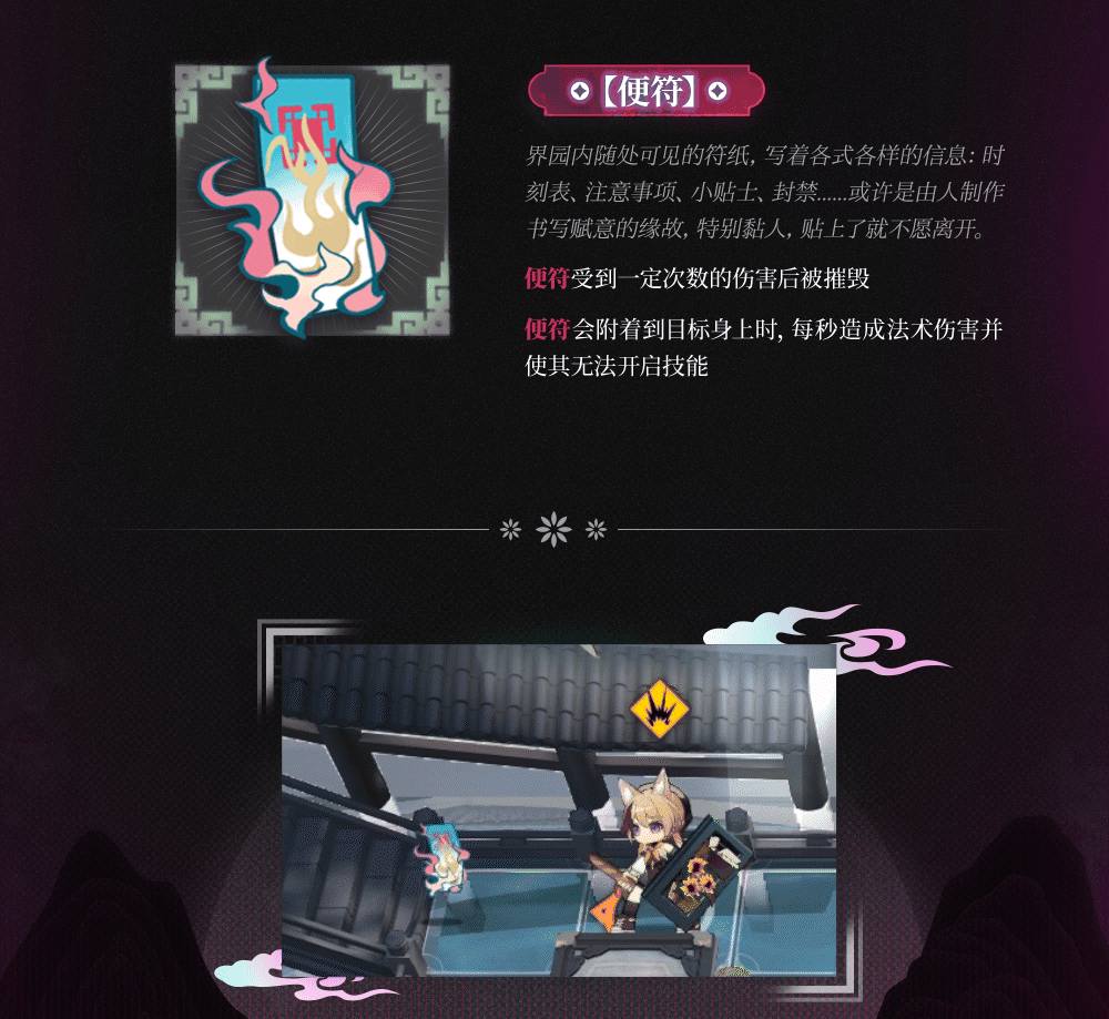 - 便符が目標に付着時、術ダメージを毎秒与え、スキルが発動できなくなる。
