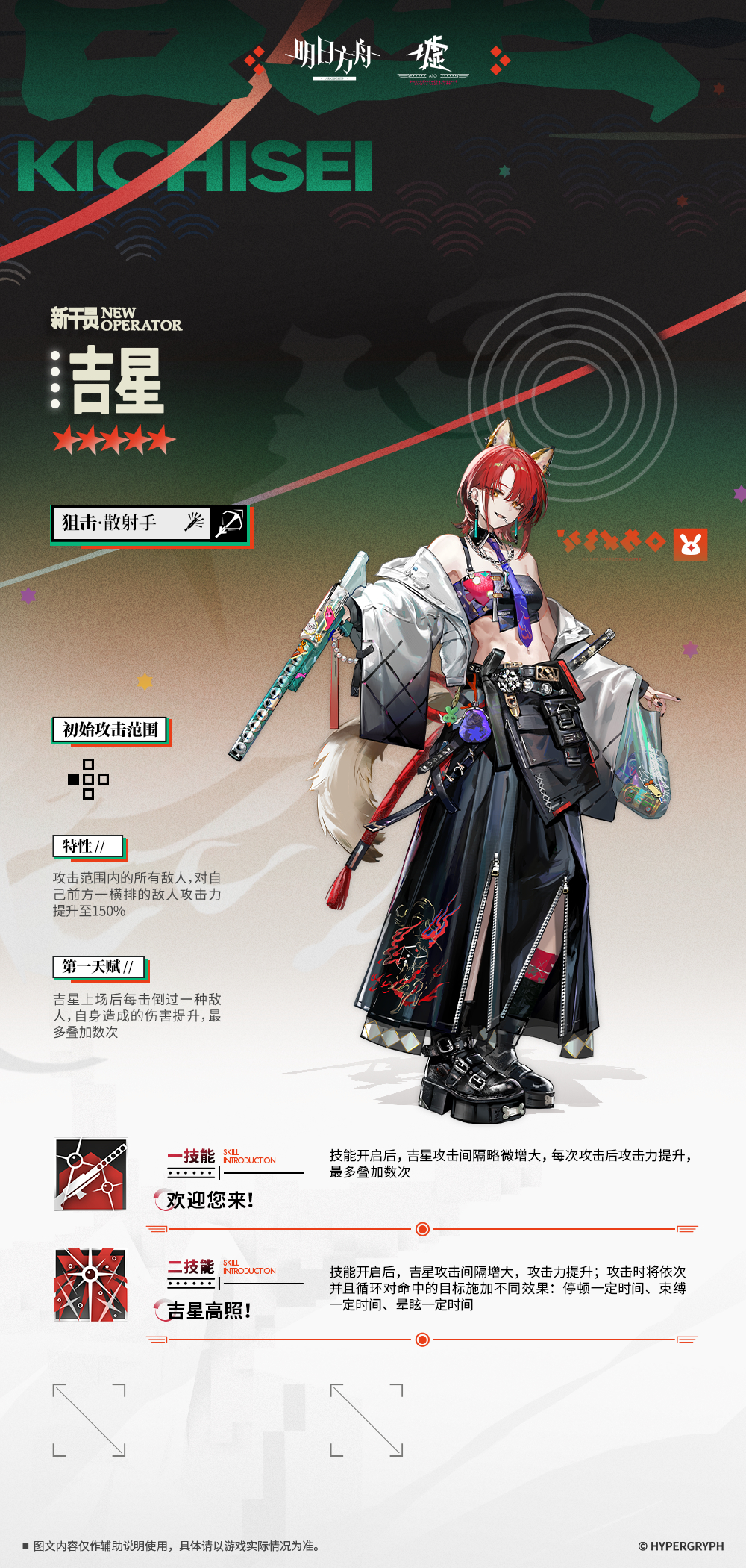 - 素質:キチセイ配置後、敵を一種類撃破する毎に自身が与えるダメージが上昇、最大数回まで重複