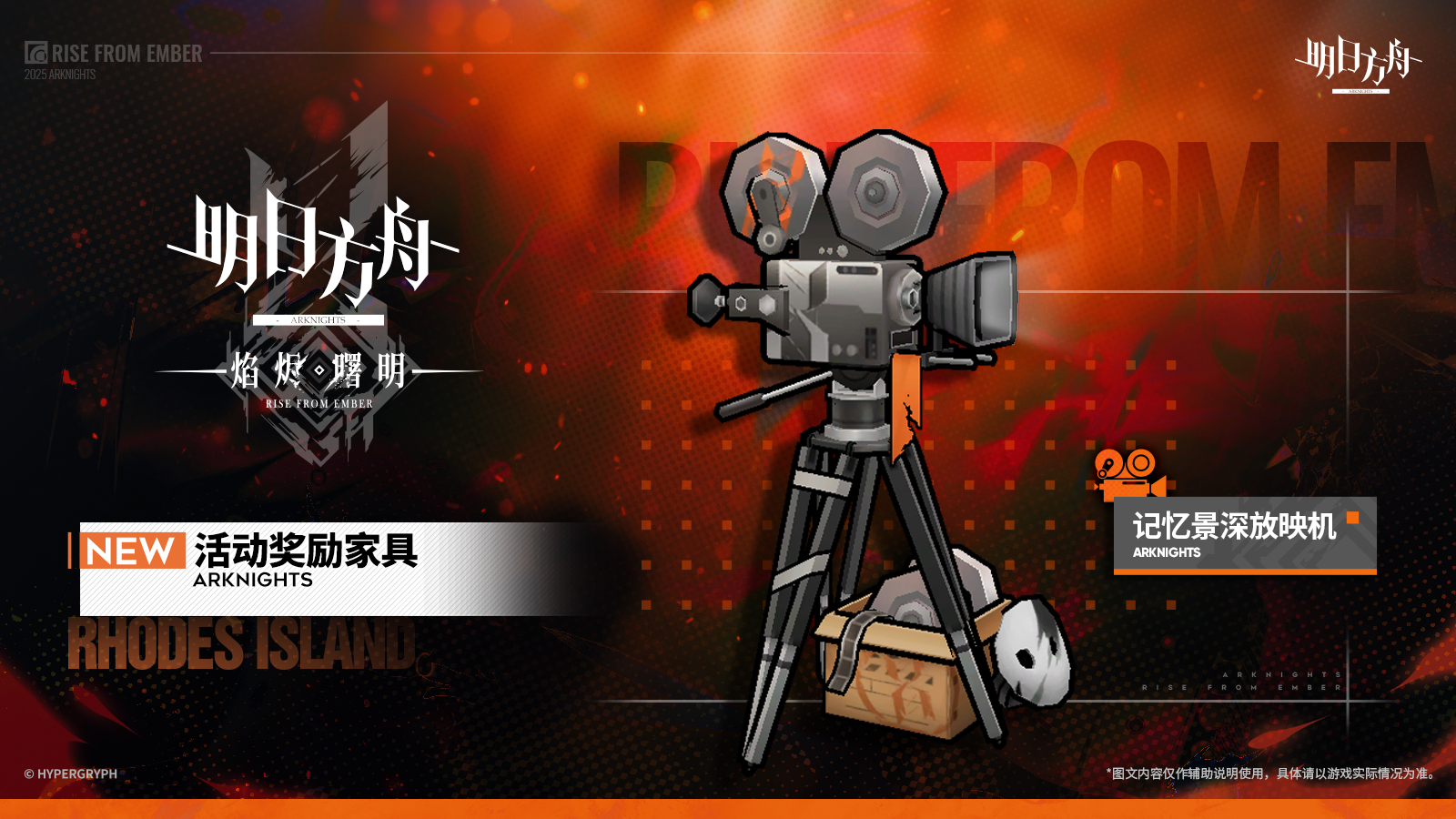 【アークナイツ大陸版】家具「記憶被写界深度映写機」 アークナイツ X Mastodon Bluesky Misskey Facebook コピー 2025.09.05 アニメ放映終了を記念して特注された映写機。 夜の炎が燃え尽き、ようやく夜明けが訪れる。 記憶の長い川に沿って上り、徐々にぼやけていく情景の中には誰の姿が残っている?