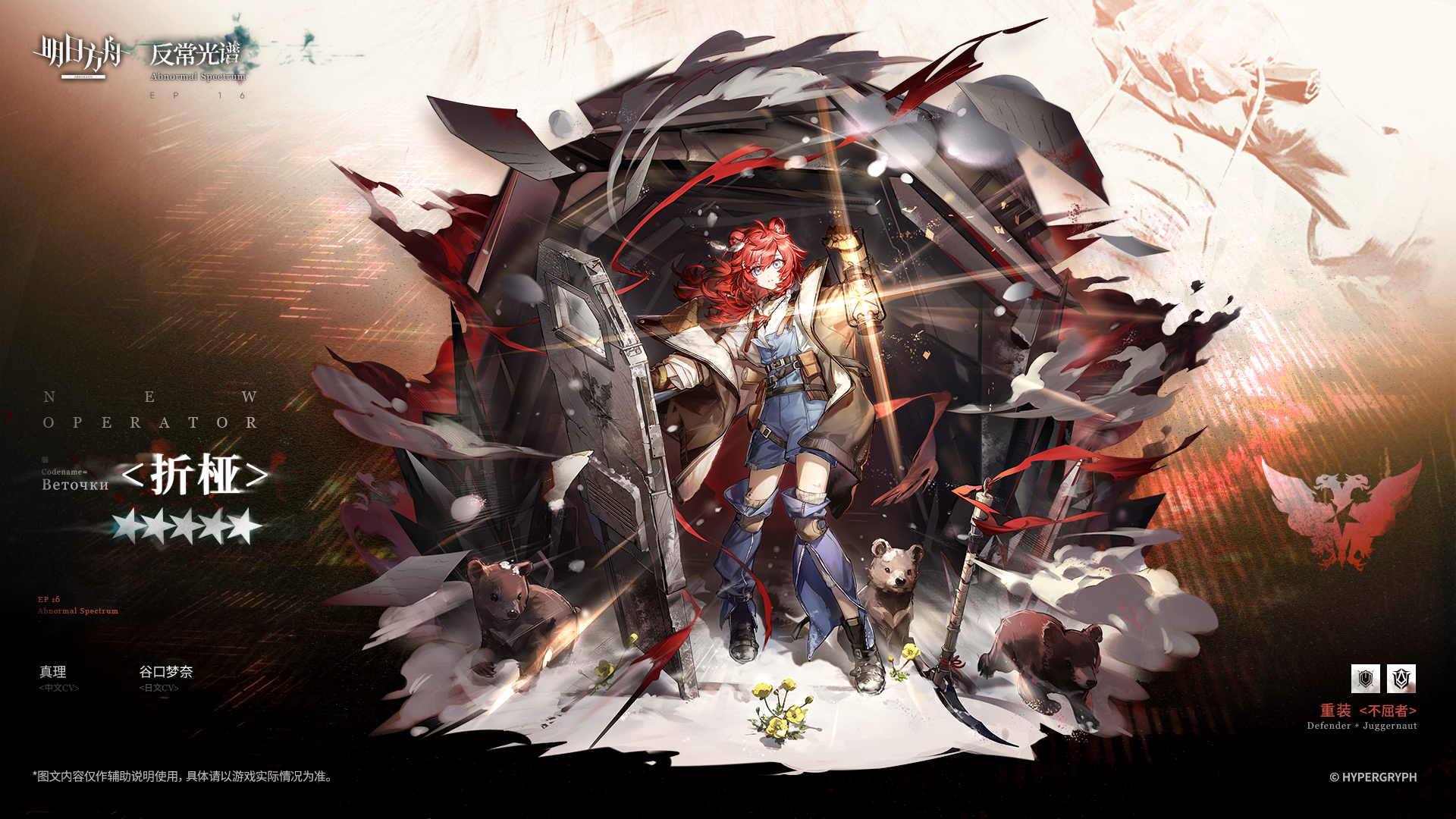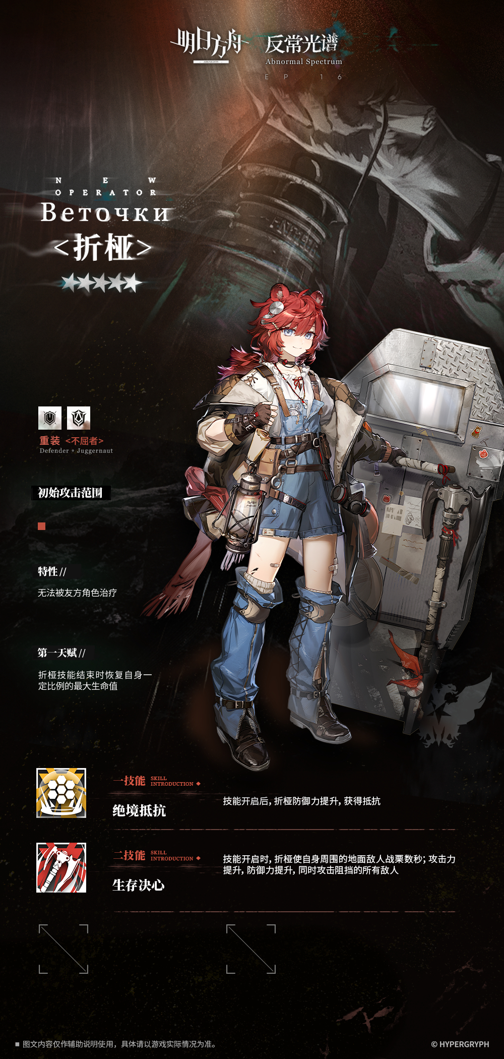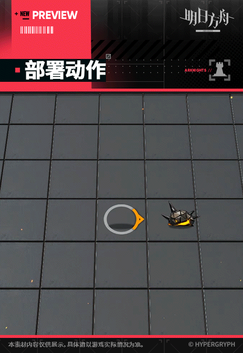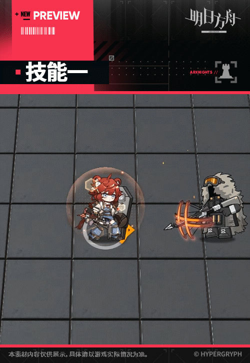 - スキル2:スキル発動時、自身の周囲の地上敵に数秒間の戦慄を付与、攻撃力上昇、防御力上昇、ブロックしている全ての敵を攻撃する。