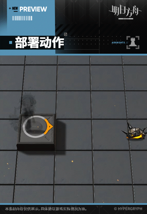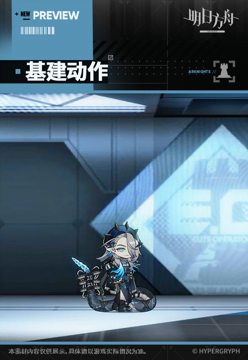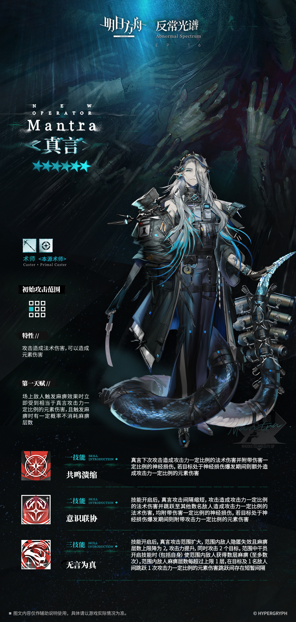 - スキル3:攻撃範囲拡大、範囲内にいる敵はステルスが無効化され、麻痺の重複上限が2に低下。攻撃力上昇、複数の敵を同時に攻撃し、範囲内にいるオペレーターがスキルを発動した時(自身を含む)、範囲内の敵に複数の麻痺(最大で数回)を付与、範囲内の敵の麻痺の超複数が上限を越える度に、対象と敵1体の間を攻撃力の一定割合の元素ダメージが1回跳躍する。跳躍の発動には短い間隔が存在する。