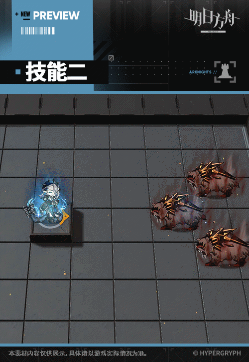 - スキル2:攻撃間隔短縮、攻撃時、攻撃力の一定割合の術ダメージを与え、数人の敵に対して跳躍が発生し、一定割合の術ダメージを与える。各攻撃はいずれも与えたダメージの一定割合の神経損傷を付与され、対象が神経爆発中であれば追加で攻撃力の一定割合の元素ダメージを与える。