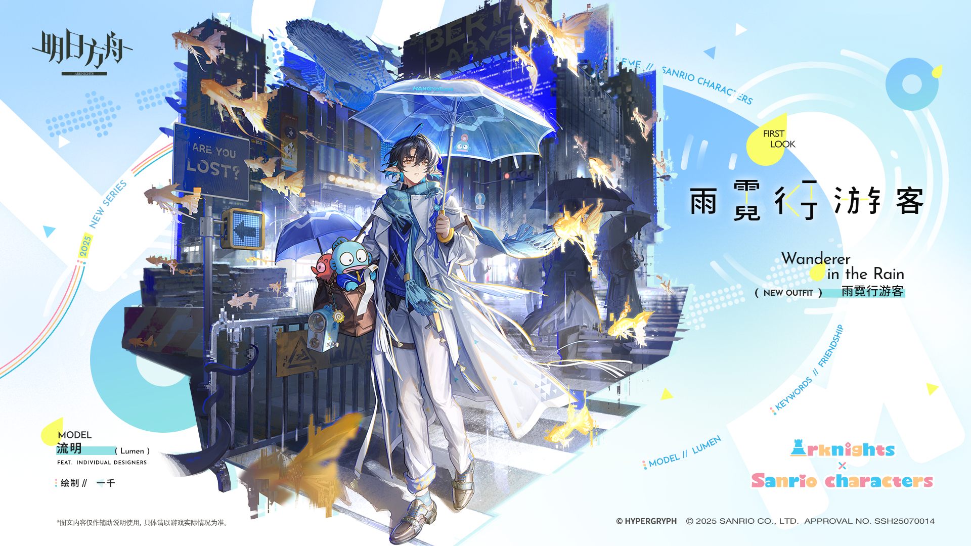 【アークナイツ大陸版】ルーメン専用コーデ「日照雨の旅人」 アークナイツ X Mastodon Bluesky Misskey Facebook コピー 2025.10.17 コラボウェア「日照雨の旅人」。 透明な傘に付いた雨粒が足元に滑り落ち、夜風が白いコートの裾を翻す。 前途は何処まであるか分からないが、彼は自分が進むべき道を知っている。 どれほどの都市の喧騒を抜け、どれほどの人混みを通り過ぎたか。 彼は今もなお、この世界においては小さな欠片に過ぎない。 しかし、今と未来、彼はもう独りでは無い。