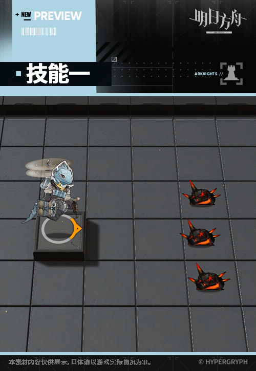 - スキル1:次の攻撃は投擲源石爆弾に代わり、爆発範囲が拡大、攻撃力の一定割合の物理ダメージを与える。チャージ可能