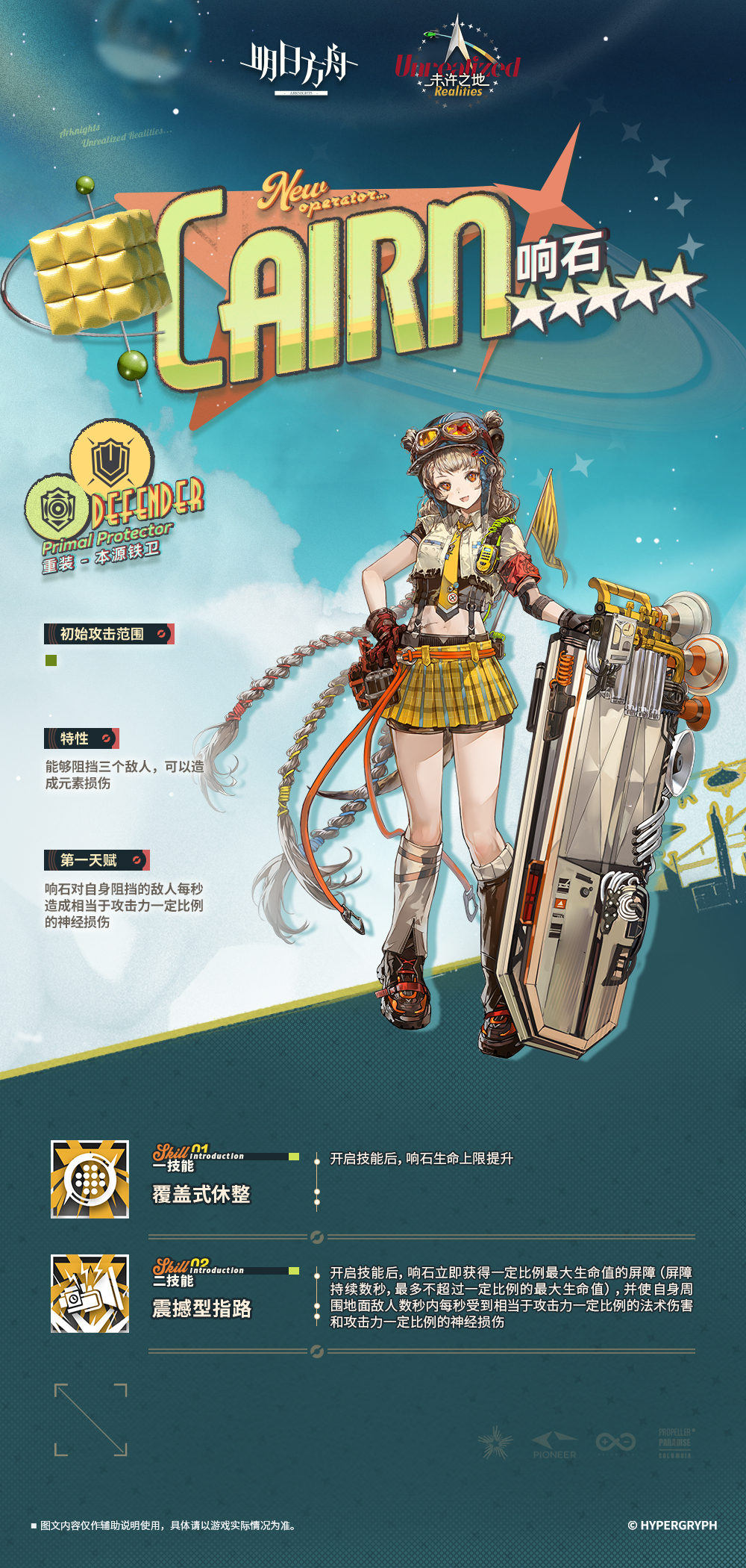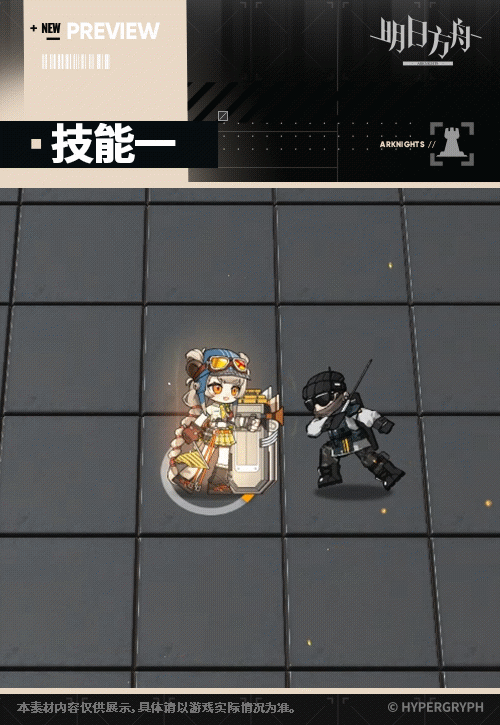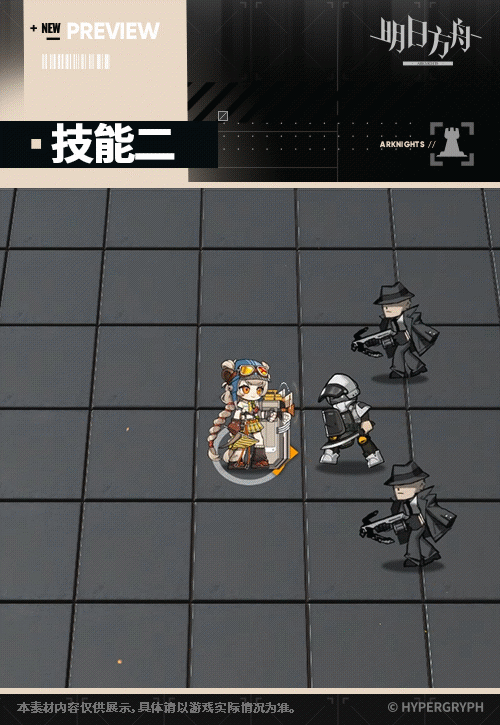- スキル2:スキル発動時、最大HPの一定割合のバリアを獲得(数秒間継続、最大HPの一定割合は超えない)、自身の周囲の地面マスにいる敵に数秒間、攻撃力の一定割合の術ダメージと神経損傷を毎秒与える。