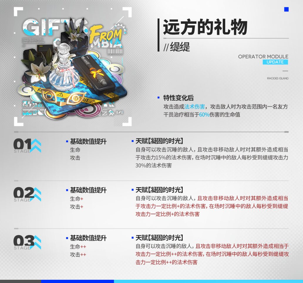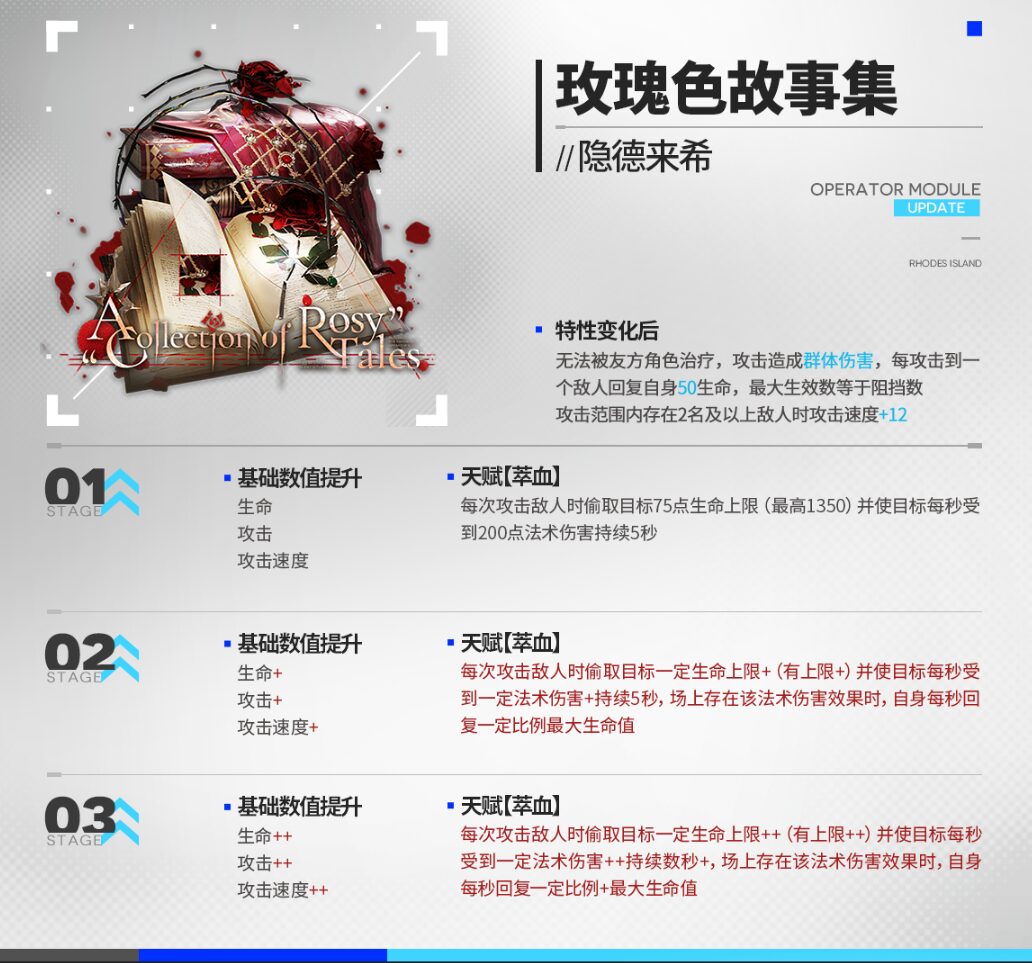 | 味方の治療対象にならない 攻撃は範囲物理ダメージを与え、敵を1体攻撃する度自身のHPを50回復 攻撃範囲内に敵が2体以上存在する場合、攻撃速度+12 |