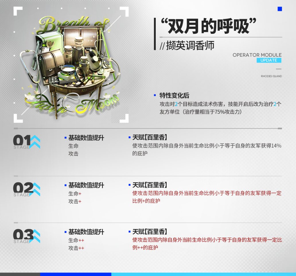 | 2体の敵に同時に術ダメージを与える。 スキル発動中、通常攻撃が味方2人に対する治療行動になる (HP回復量は攻撃力の75%) |