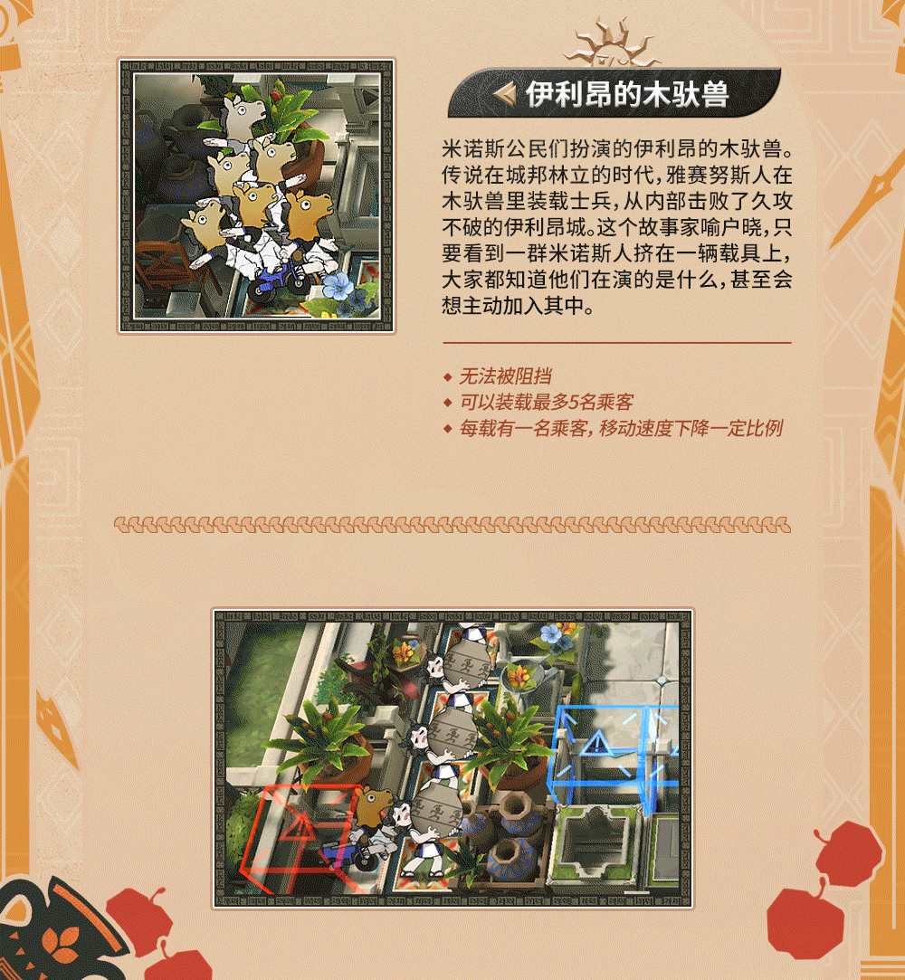 都市国家が林立した時代、アテヌス人は木馬に兵士を潜ませ、内部から難攻不落のイリオン城を陥落させたという伝説がある。この物語は広く知られており、ミノス人たちが乗り物に詰め込まれている姿を見れば、誰もが彼らの演じているものが何であるか理解し、自ら進んで参加したくなるほどである。