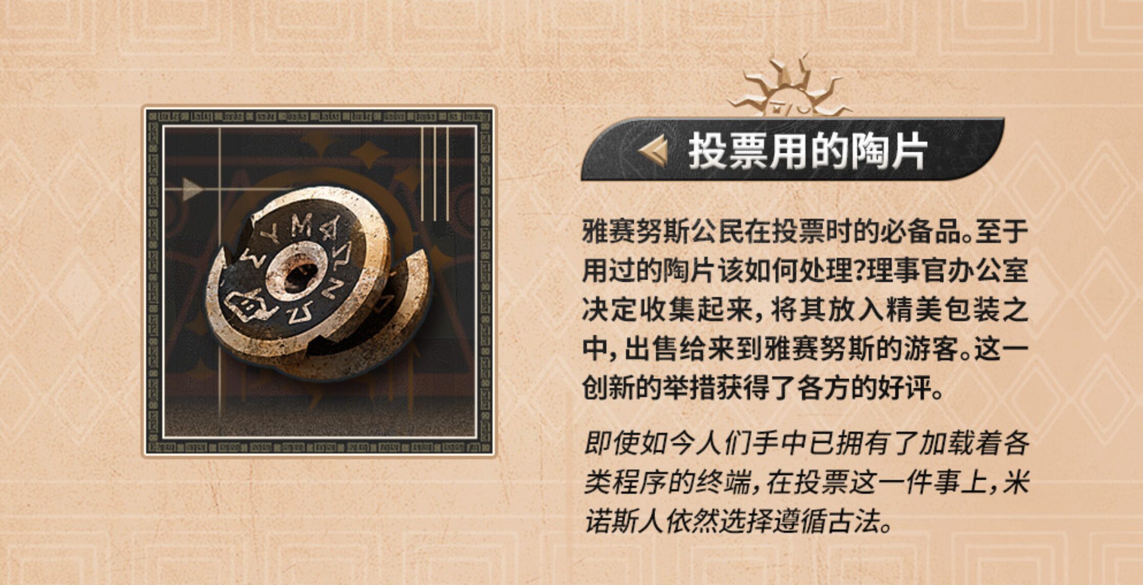 アテヌス市民が投票する時に必須の品。使用済みの陶片の処理方法については、評議員事務局が回収し、精巧な包装を施してアテヌスを訪れる観光客へ販売することを決定した。この革新的な取り組みは各方面から高い評価を得ている。