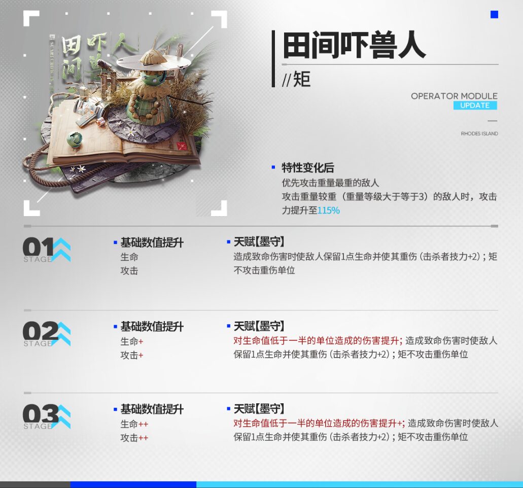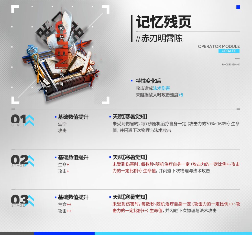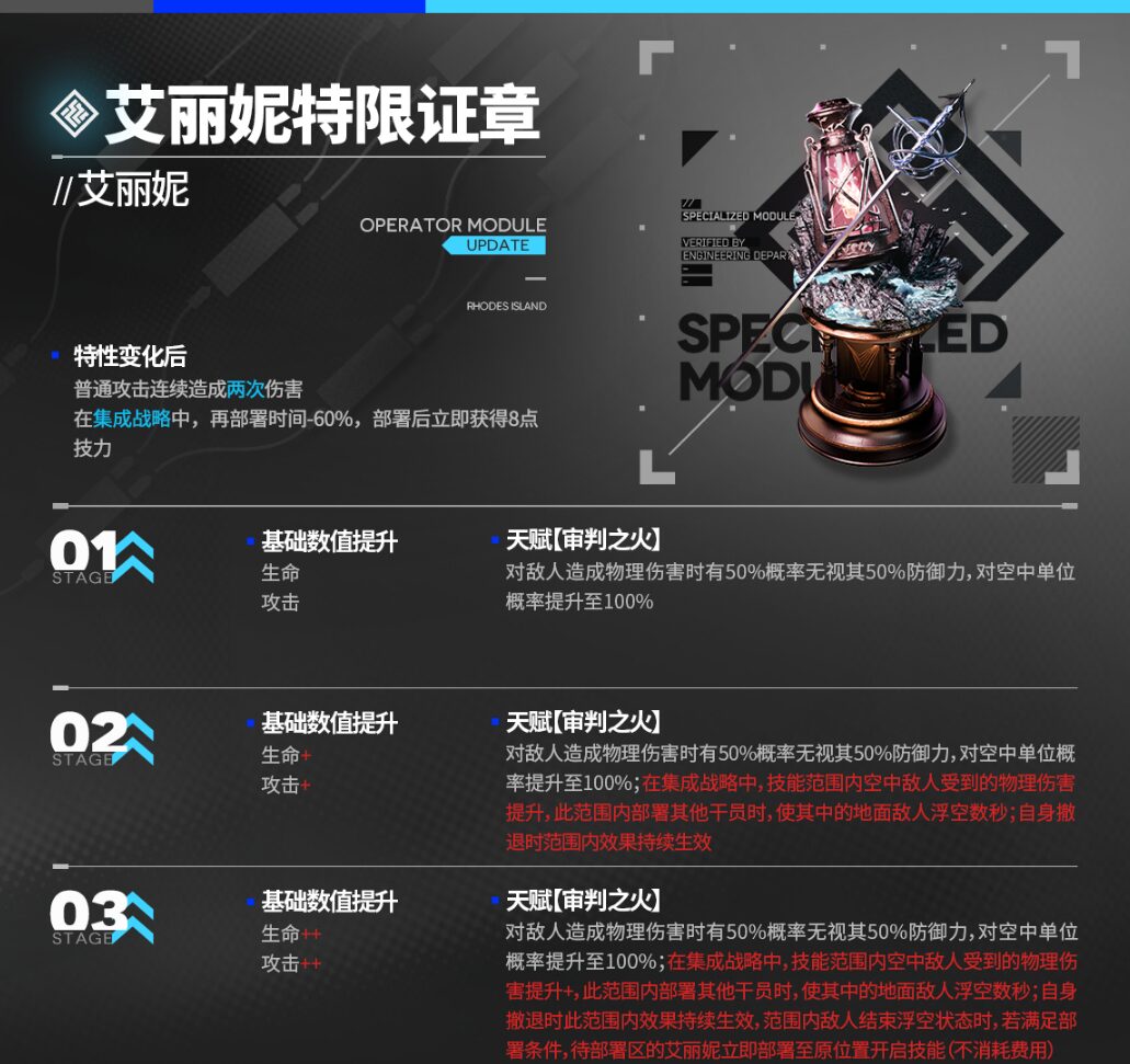 | 通常攻撃時、1回の攻撃で2回ダメージを与える 統合戦略中、再配置時間-60%、配置時、SP+8 |