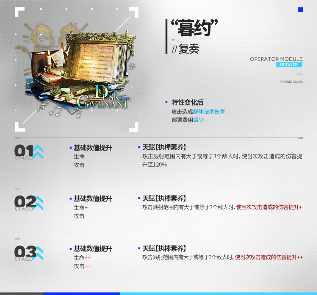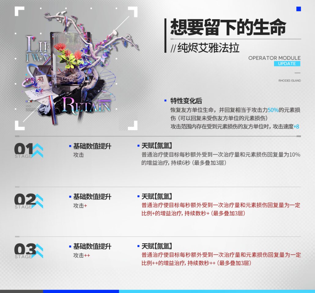 | 味方のHPを回復し、同時に対象に蓄積された元素損傷を 自身の攻撃力の50%の値分治療する (HP最大の味方も元素損傷の治療対象となる) 攻撃範囲内に元素損傷を受けた味方ユニットが存在する場合、攻撃速度+8 |