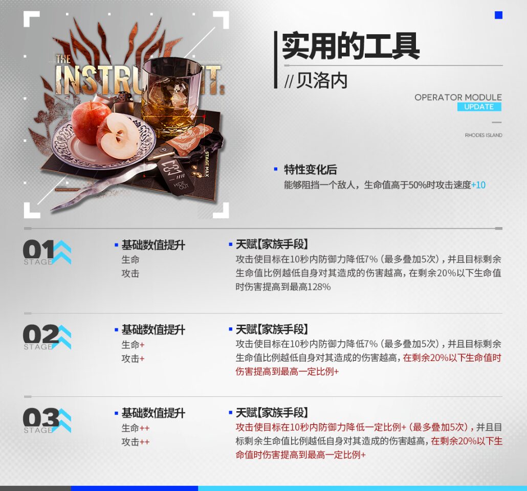 | 敵を1体までブロック HPが最大値の50%を上回った場合、攻撃速度+10 |