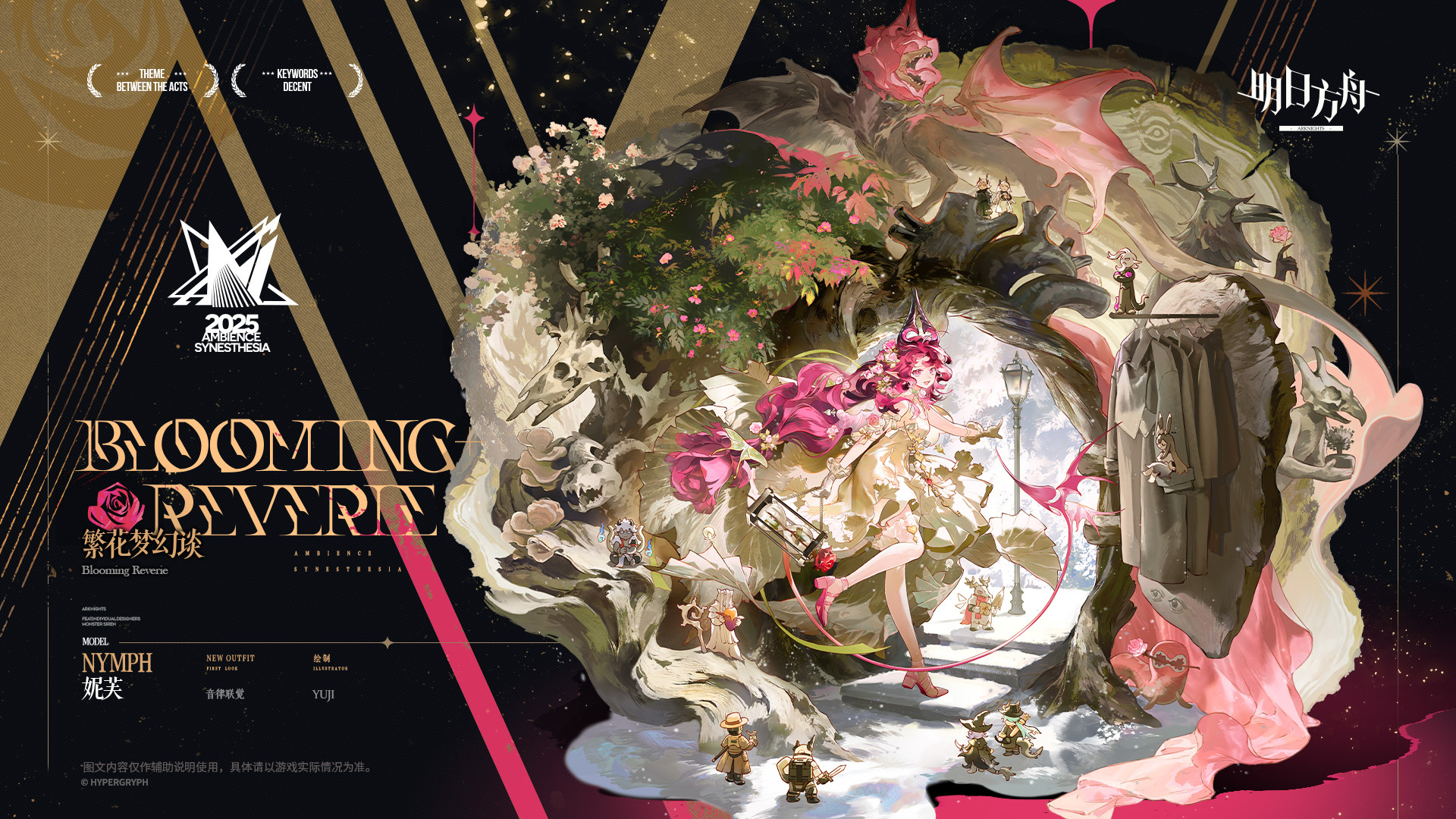 【アークナイツ大陸版】ニンフ専用コーデ「花々の幻想談」 アークナイツ X Mastodon Bluesky Misskey Facebook コピー 2026.04.04 『音律聯覚』特別モデル/花々の幻想談。 ニンフが自ら選んだサテン製のドレス。ふわりと広がる淡い色のスカートが花のようなアップスタイルを映し出し、まるで庭園で優雅に舞い踊る精霊のような軽やかで陽気な雰囲気を醸し出している。 アーケードをくぐり抜け、小さな橋を渡り、低木林の中にある角を曲がっていく。しかし、園内の何処にいようと、咲き誇る花々の中でも彼女が最も目を引く一輪だった。