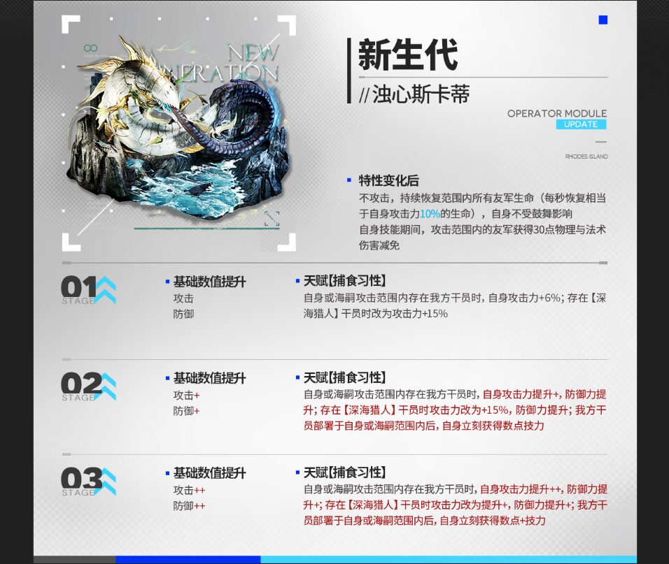| 攻撃しない。 攻撃範囲内の味方全員のHPを継続回復する(毎秒、自身の攻撃力の10%分回復)。 自身は鼓舞効果を受けない。自身のスキル発動中、攻撃範囲内の味方は物理・術ダメージを30軽減。 |