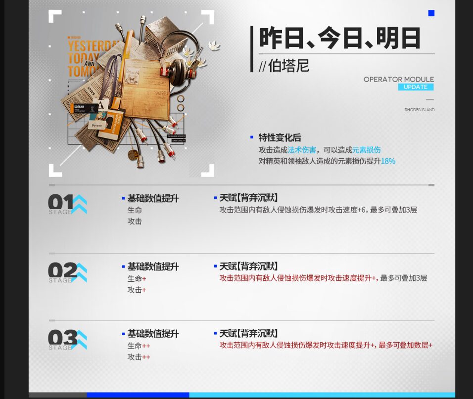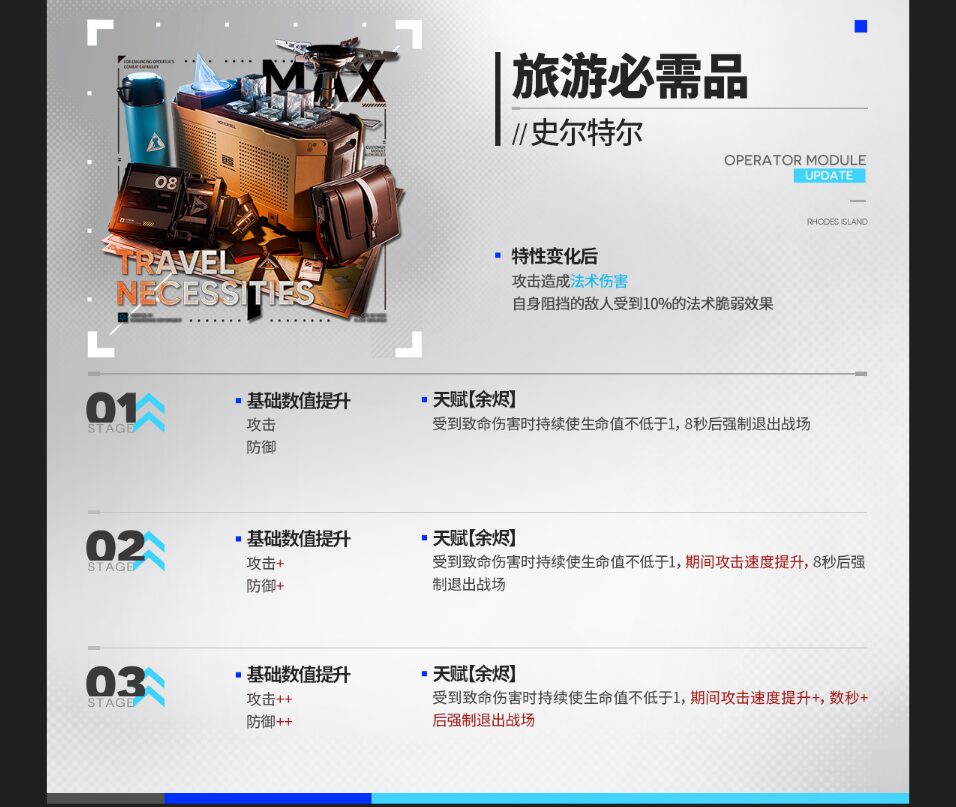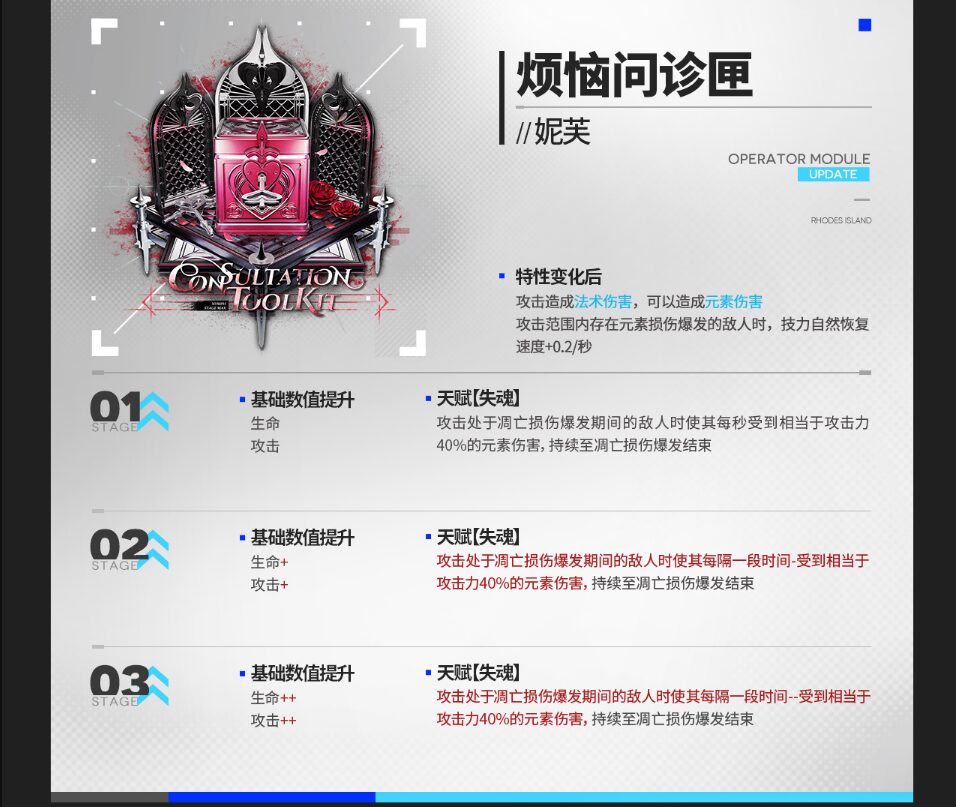 | 敵に術ダメージを与える。 元素ダメージを与える能力を持つ。 攻撃範囲内に元素損傷爆発中の敵がいる場合、SP自然回復速度+0.2/秒。 |