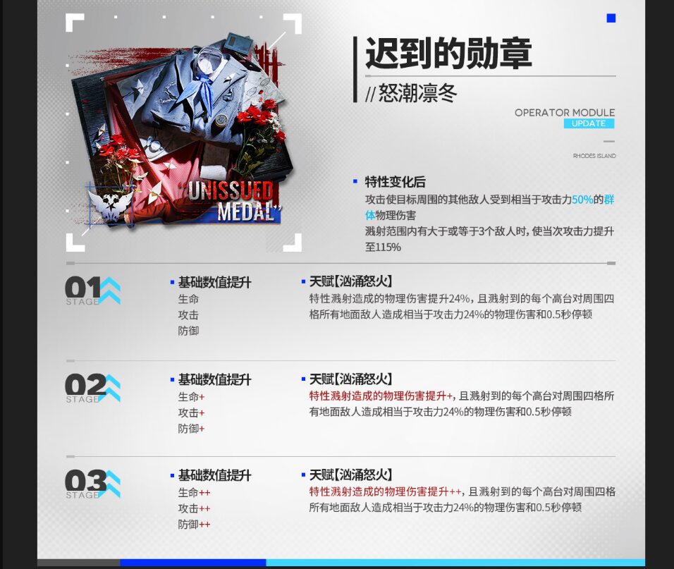 | 攻撃対象の周囲の他の敵に、攻撃力の50%の範囲物理ダメージを与える。 周囲8マス内に敵が3体以上いる時、通常攻撃の攻撃力が115%まで上昇。 |