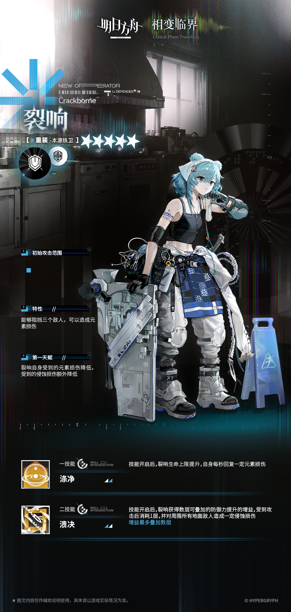 - スキル2:スキル発動後、防御力が上昇する効果を複数回獲得(重複可能)。攻撃を受けると1層消費され、周囲の全ての地上敵に一定数の浸蝕損傷を与える