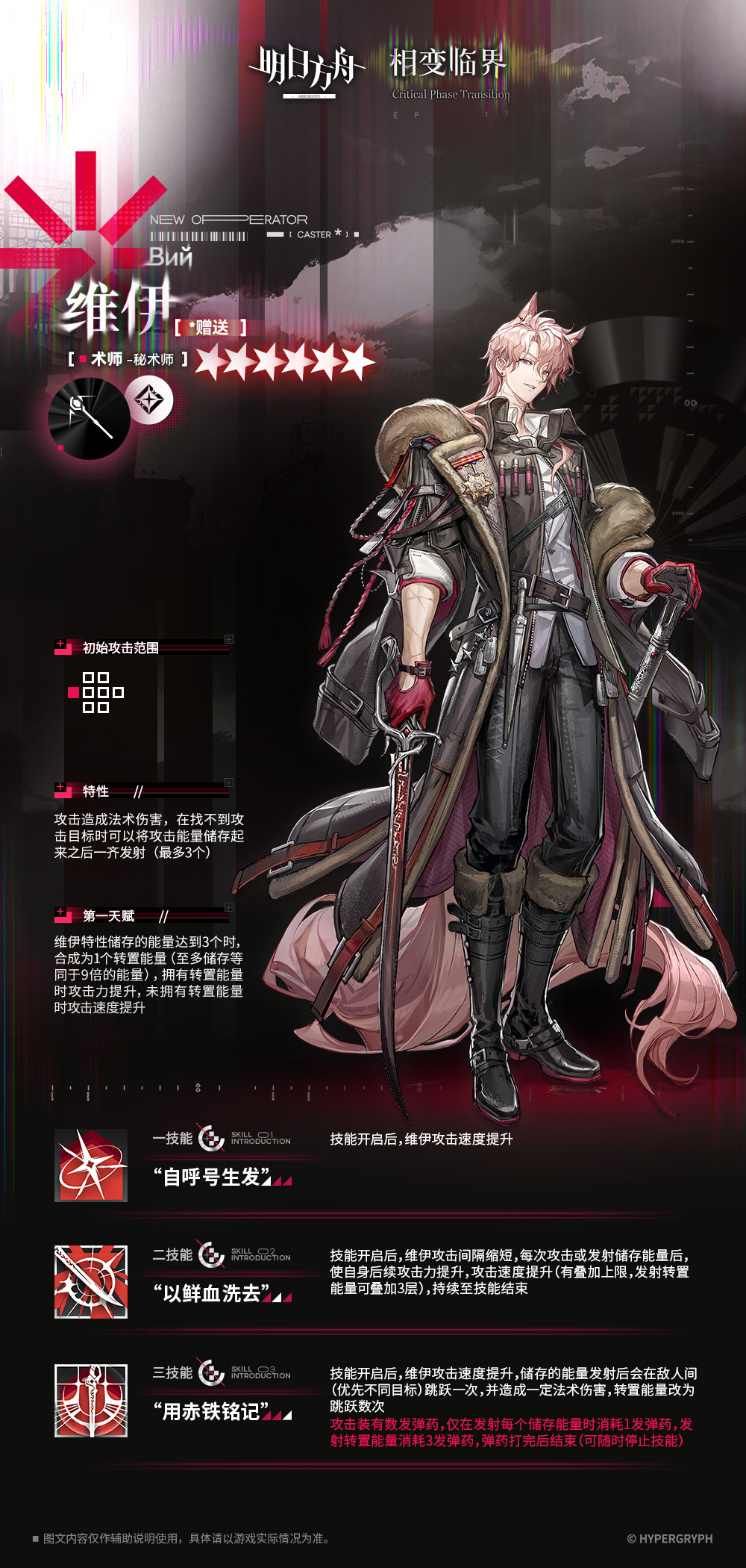 - スキル2:攻撃間隔短縮、攻撃又はエネルギーを発射する度に、その後の攻撃力と攻撃速度が上昇(重複上限あり、転置エネルギーを発動する事で最大で3回まで重複可能)。効果はスキル終了まで継続。