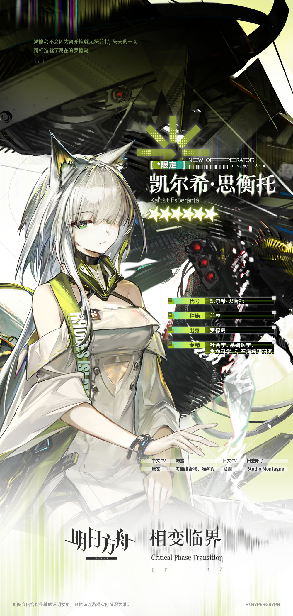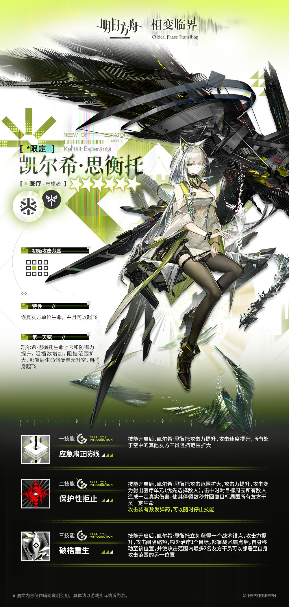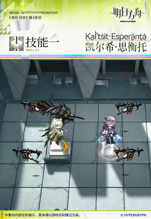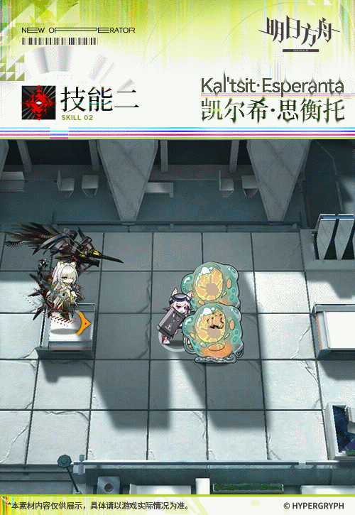 - スキル2:攻撃範囲拡大、攻撃力上昇、攻撃は医療ユニットを発射するようになり(敵ユニットを優先して選択)、命中時、目標周辺の全ての敵に一定の確定ダメージを与え、目標周辺全ての味方オペレーターのHPを回復する。一定数の銃弾を撃ち切るとスキルが終了(手動でスキルを停止可能)
