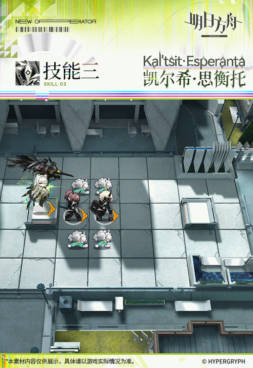 - スキル3:即座に戦術アンカーを獲得、攻撃力が上昇、攻撃間隔が短縮、対象を1対追加で回復。戦術アンカーを展開後、自身はその位置に移動し、攻撃範囲内の最大2体の味方オペレーターを自身の攻撃範囲内の別のマスに配置出来る