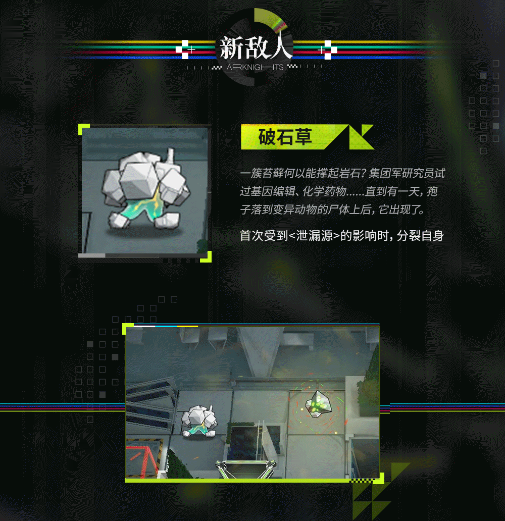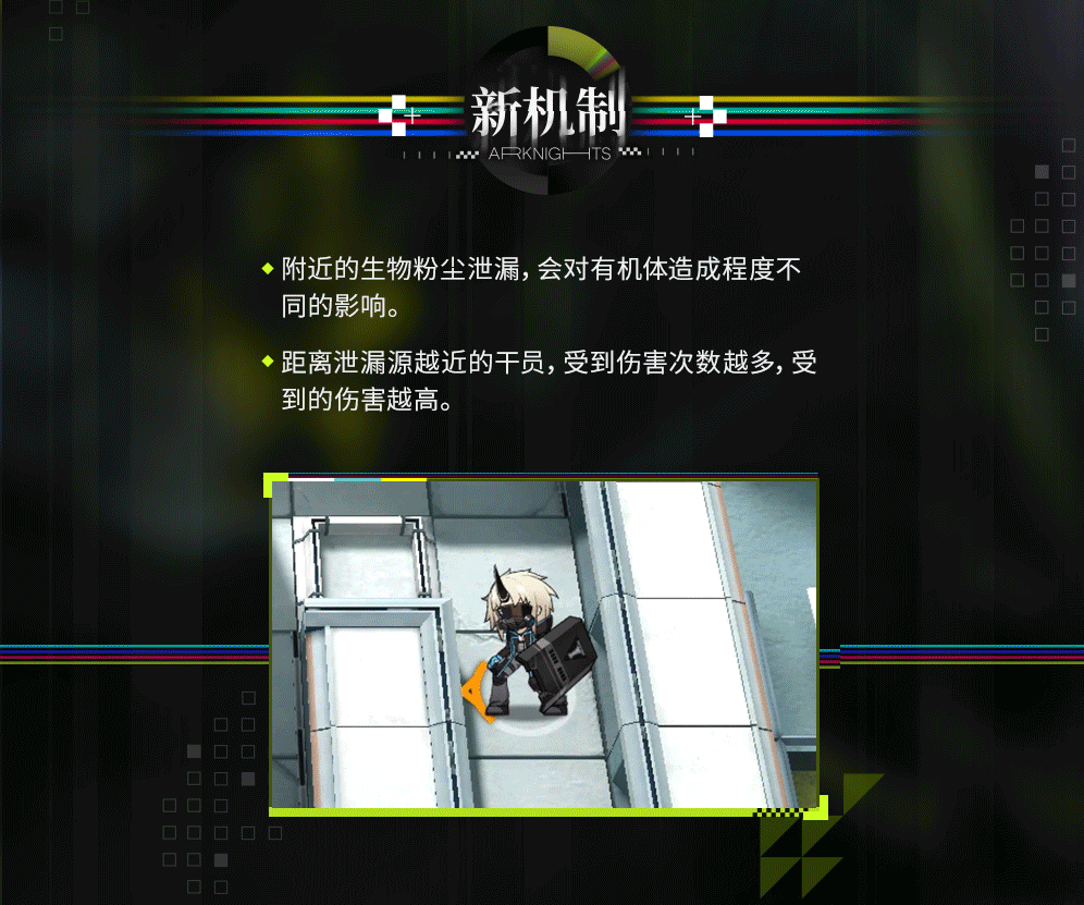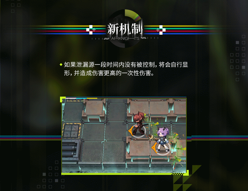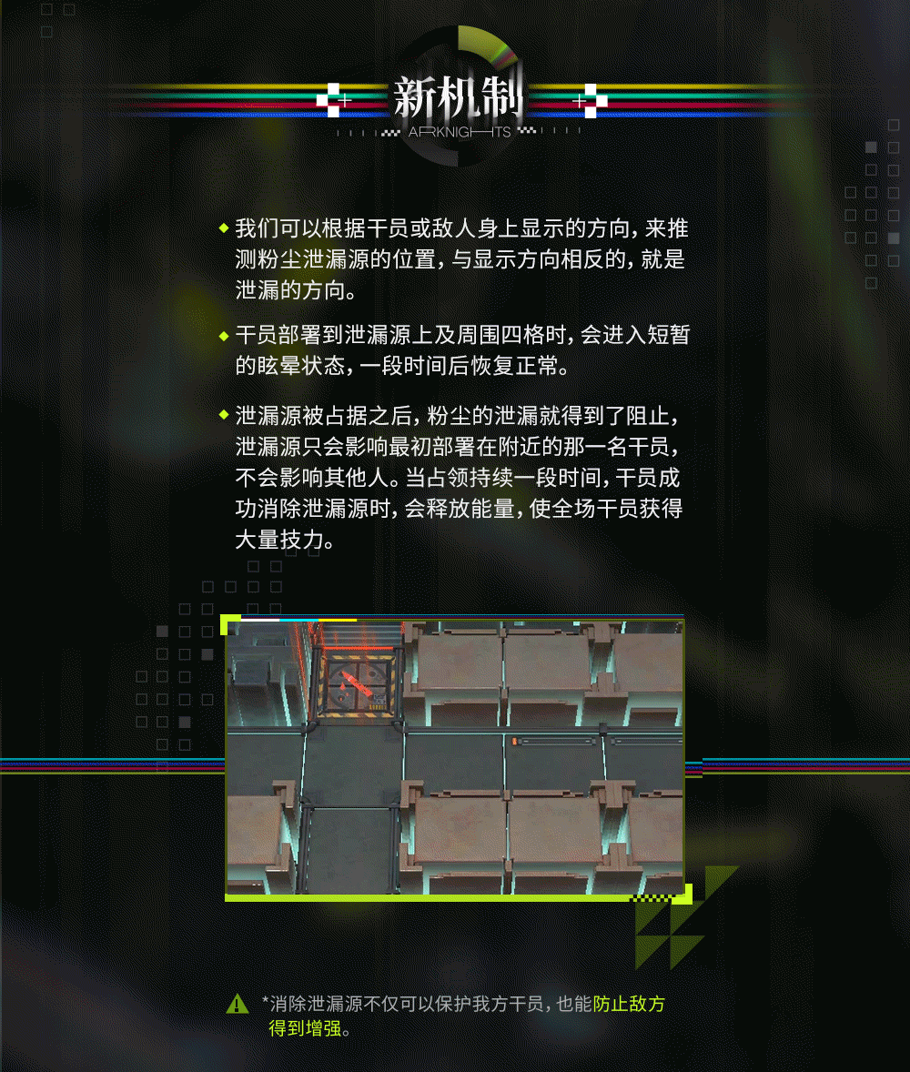 - 漏洩源が占拠されると粉塵の漏洩は阻止されます。漏洩源の影響を受けるのは最初にその付近に配置されたオペレーターのみであり、他のオペレーターには影響しません。占拠状態が一定時間続き、オペレーターが漏洩源の除去に成功するとエネルギーが解放され、フィールド内の全オペレーターが大量のSPを獲得します。