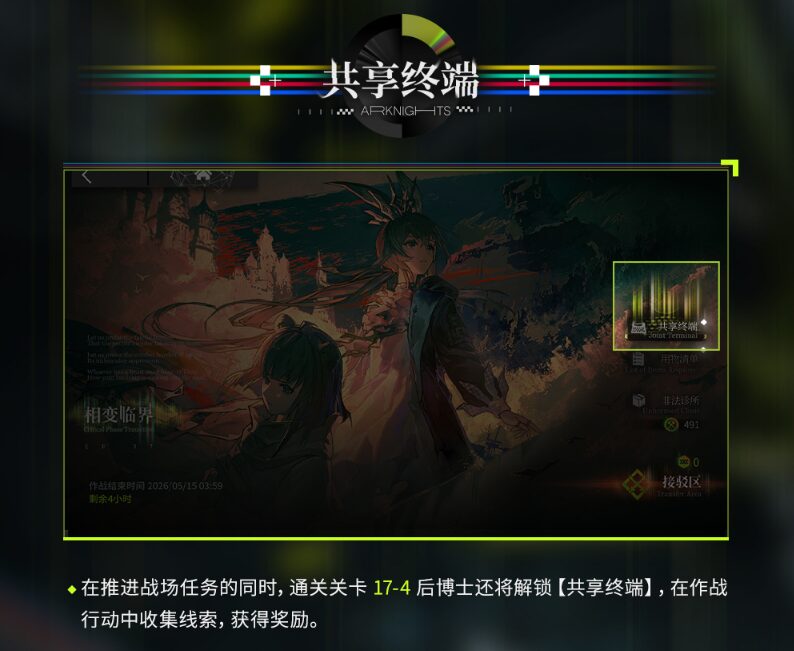 戦場の任務を進めるのと同時にステージ17-4をクリアする事で、ドクターは【共有端末】を入手、作戦行動中に手がかりを集めて報酬を獲得できるようになります。